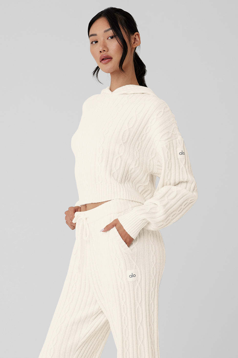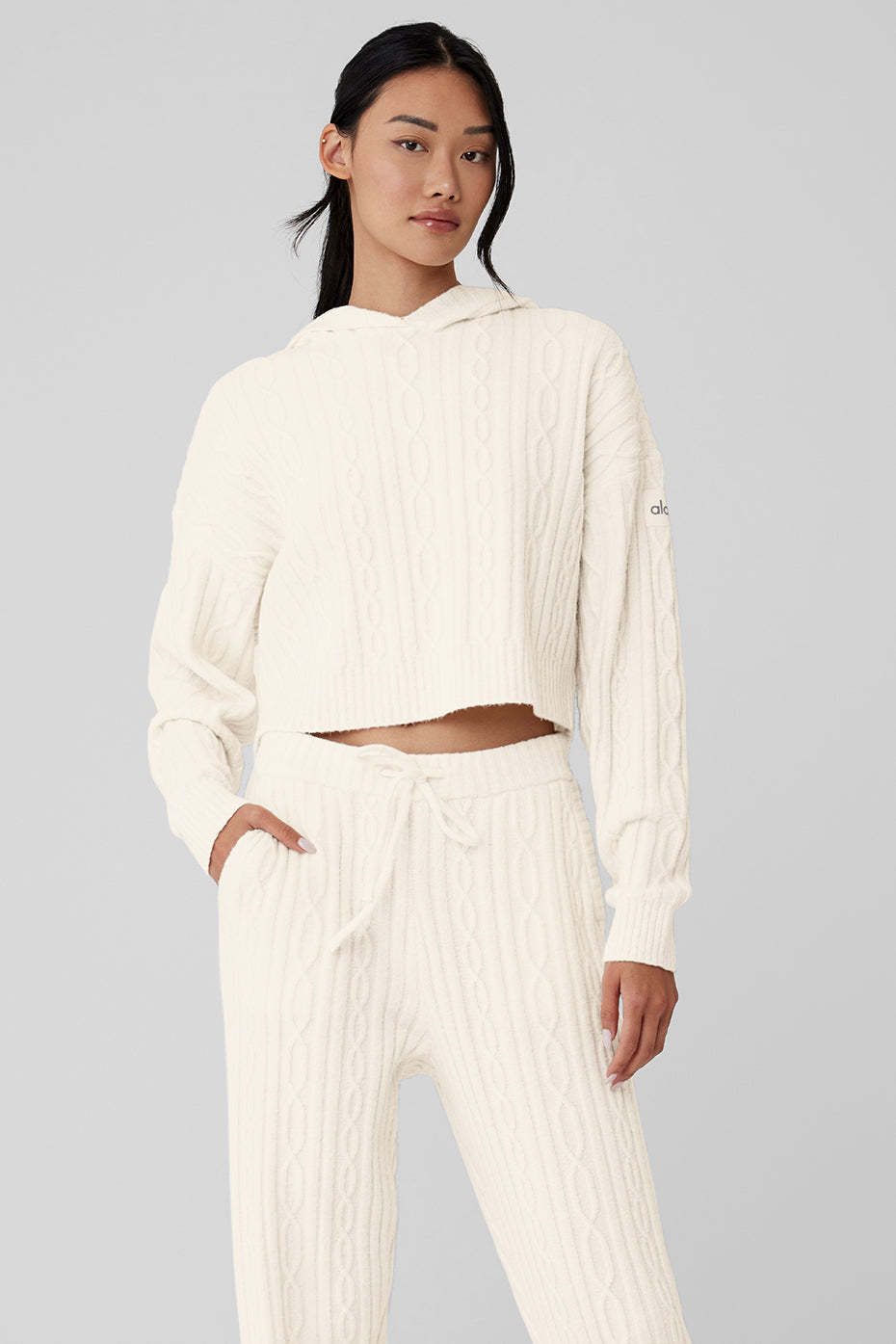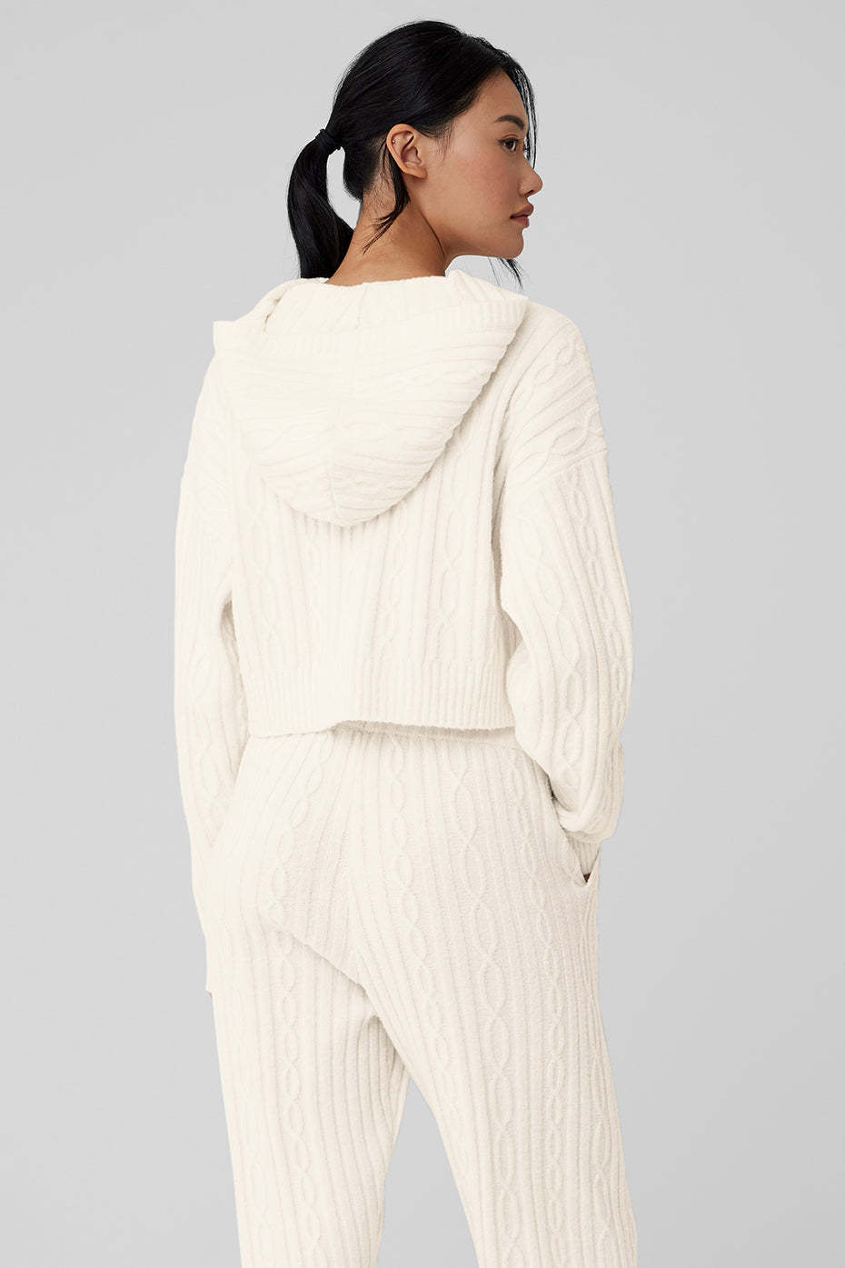 Perfect your cozy vibe in the Winter Bliss Hoodie. Designed with a chunky cable-knit and a next-level-soft, almost fuzzy feel, this closet staple has a relaxed fit with a slightly cropped hem and slits at the sides. Pair it with your favorite leggings, trousers, or〞better yet〞the matching Winter Bliss Pants.